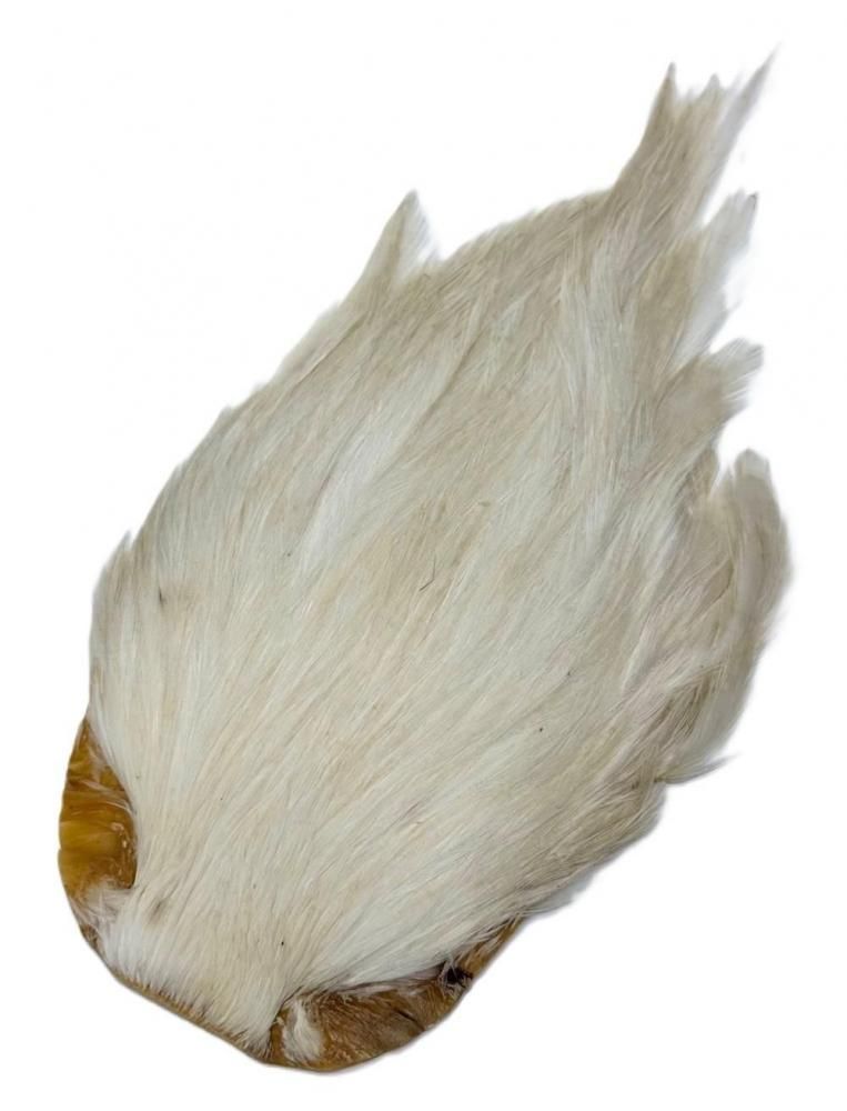 ホワイトと言っても純白ではなく、若干クリームやダンがかっています。アメリカ産ジェネティックハックルにも言えることですが、ニワトリの羽はその色が薄いほど柔らかくなるようです。 このホワイトハックルもファイバーは若干柔らかめです。ウェット、ローウォーター・フライやストリーマーに最適です。ドライフライには、#6〜#10のハックルとテールが採れます。