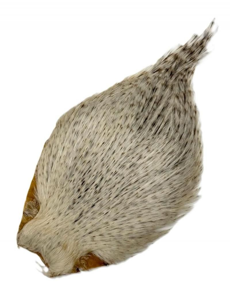 クリームに黒いスポットが入ったケープです。ドライフライには、#8〜#12のハックルとテールが採れます。巻き上りはかなり明るくなり 黒いスポットがアクセントになる魅力的なハックルです。