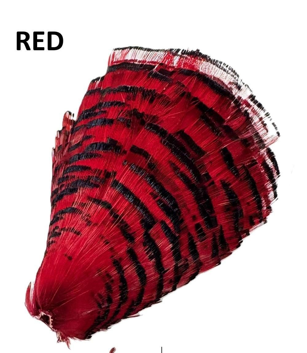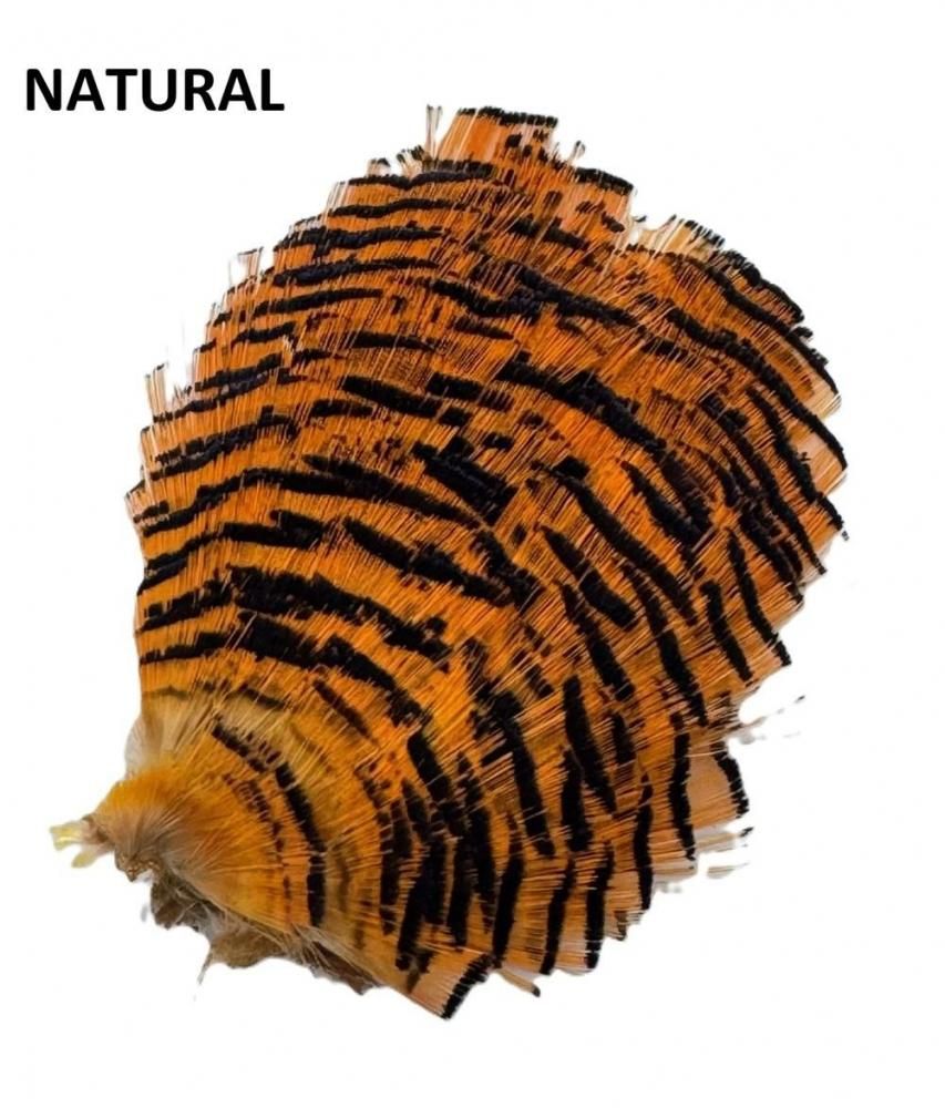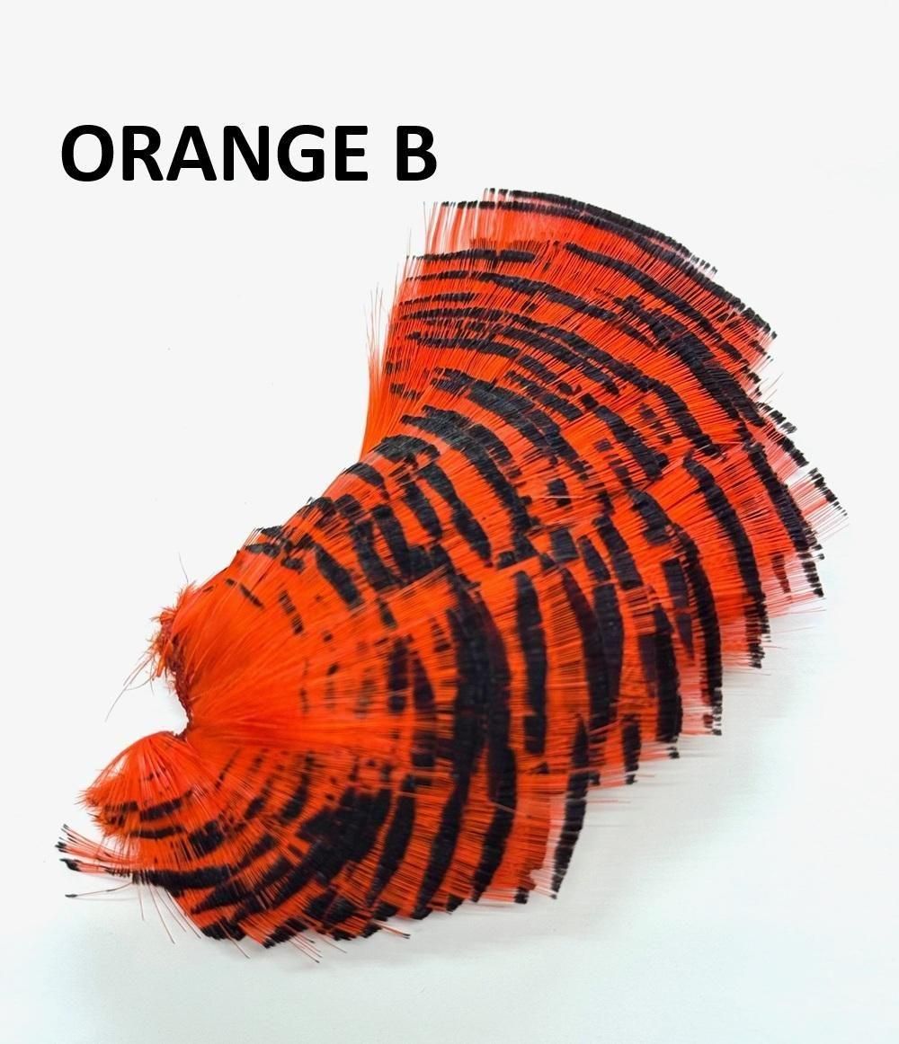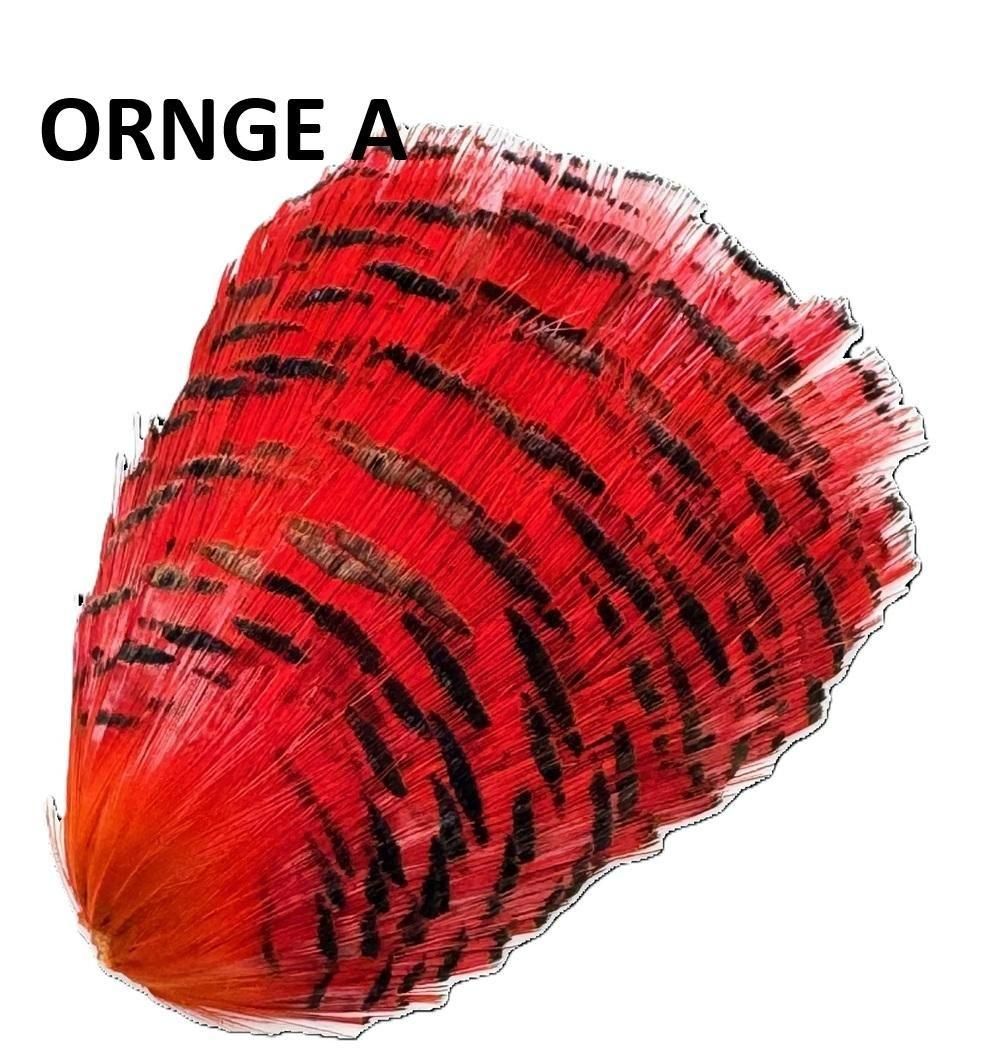 ゴールデンフェザント(金鶏)のネックフェザー。単にティペットとか、数本を差してティペットフェイバー と云われる事もある。鮮やかなオレンジに黒のバーが2本入った大変ポピュラーなマテリアルで、 小さなものはドライ、ニンフ、ウェットのテールに使用され(ロイヤルコーチマンのテイルは有名)、 大きなものはウェットやサーモンフライのテールやウィングに使用される。