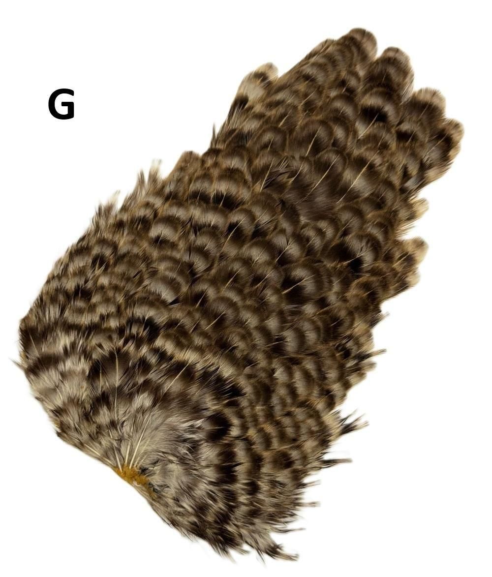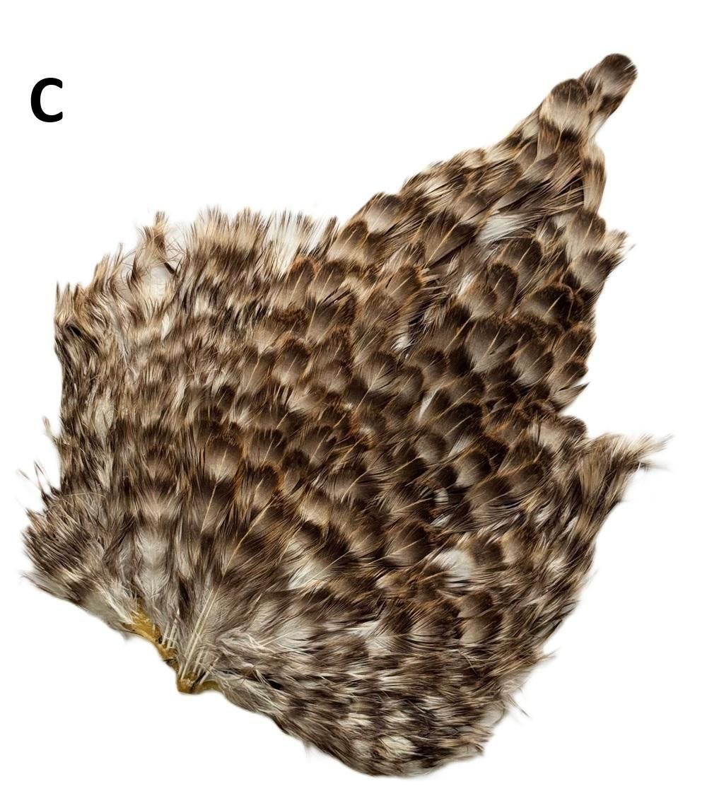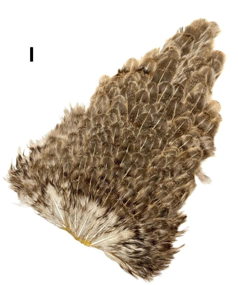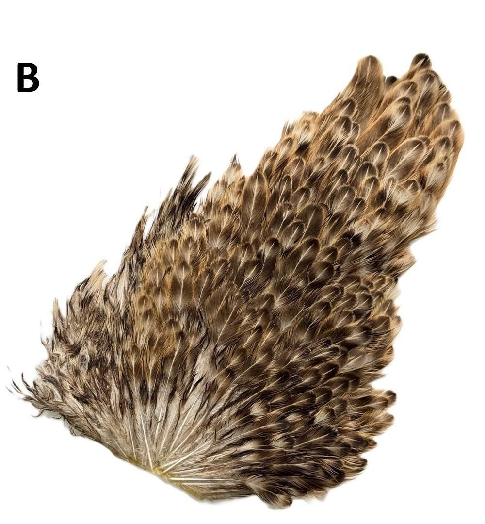 メス鶏のサドルハックルは、オス鶏と違って丸い形の極柔らかなハックルです。 ヘンネック以上に多彩な模様があり、スペックルド柄をしたハックルも多くあります。ファイバーは軟らかく長めで、ソフトハックルやウエットフライで よく使われる #12〜#6サイズがとれます。止水や緩やかな流れで威力を発揮します。それより大きなハックルは、マツーカのウイングや、フラットウィング に最適です。変わった使い方としては、スカルピンやドジョウのヒレにも面白いです。また、ウィングバーナで焼いてメイフライやカディスのウイングにしたり 色々な用途があります。