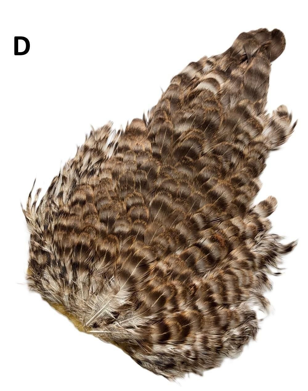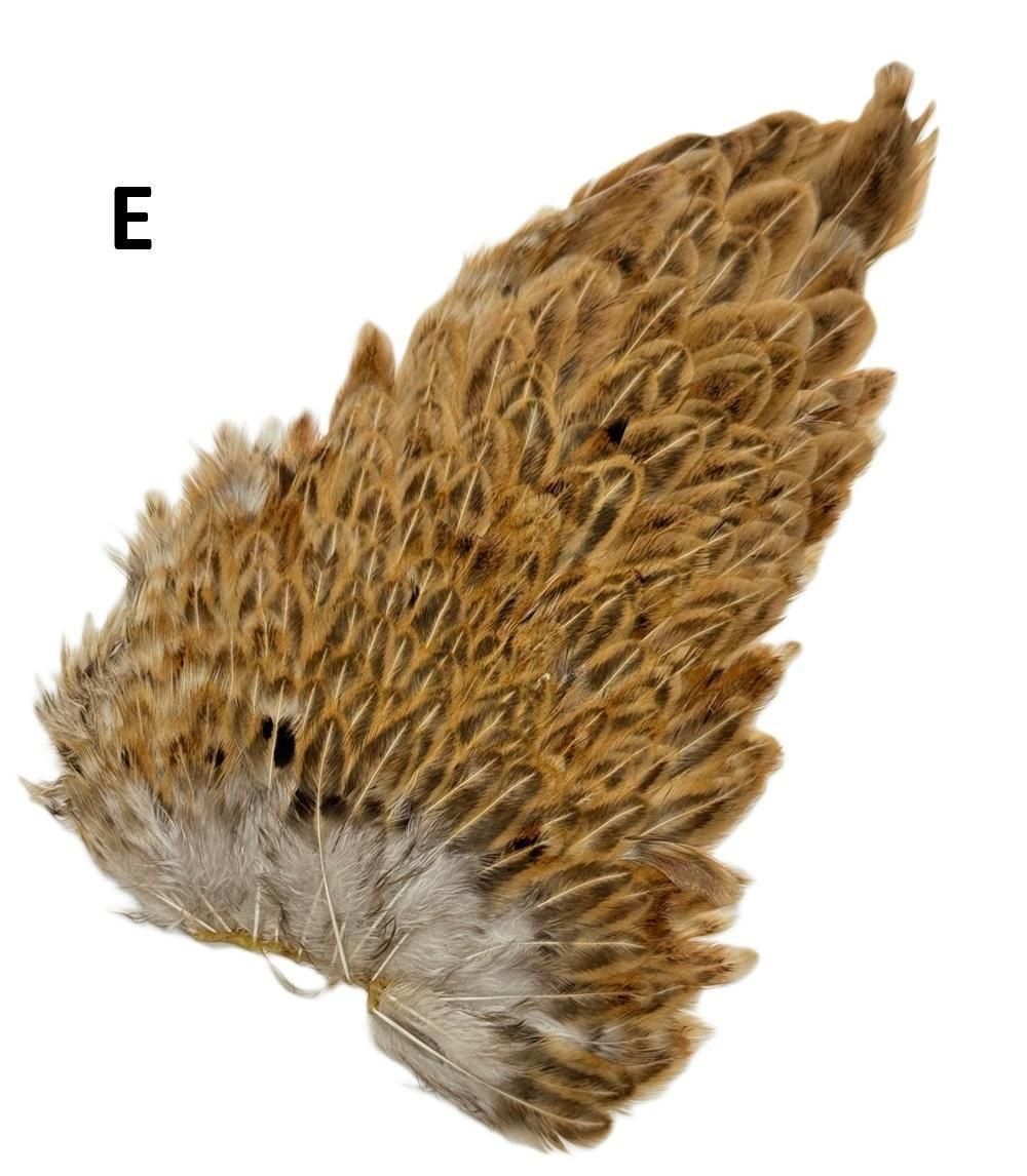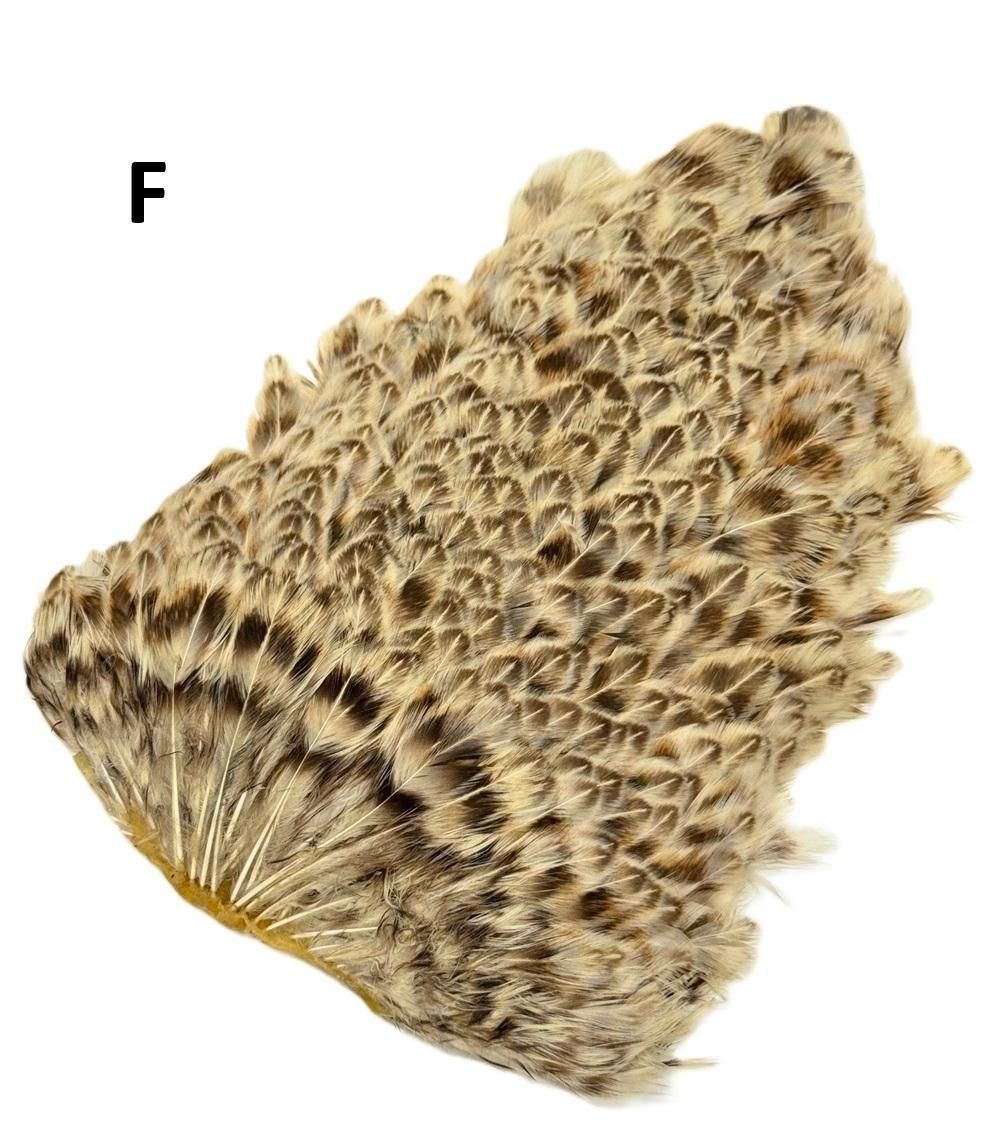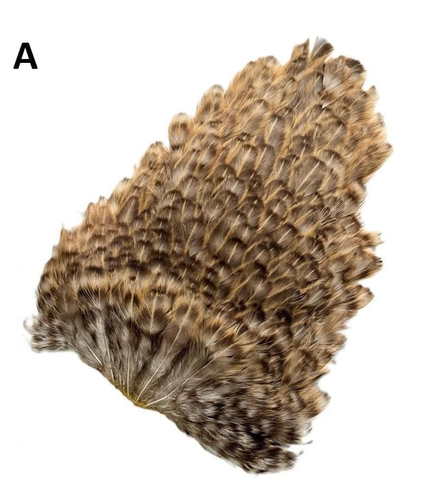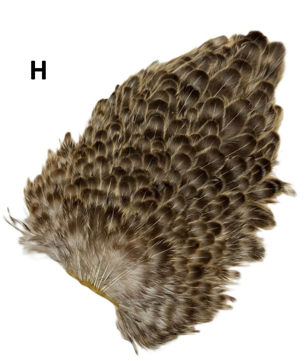 メス鶏のサドルハックルは、オス鶏と違って丸い形の極柔らかなハックルです。 ヘンネック以上に多彩な模様があり、スペックルド柄をしたハックルも多くあります。ファイバーは軟らかく長めで、ソフトハックルやウエットフライで よく使われる #12〜#6サイズがとれます。止水や緩やかな流れで威力を発揮します。それより大きなハックルは、マツーカのウイングや、フラットウィング に最適です。変わった使い方としては、スカルピンやドジョウのヒレにも面白いです。また、ウィングバーナで焼いてメイフライやカディスのウイングにしたり 色々な用途があります。