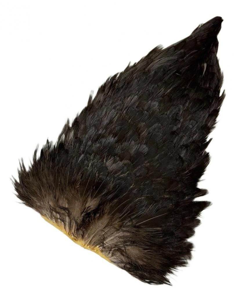 メス鶏のサドルハックルは、オス鶏と違って丸い形の極柔らかなハックルです。 ヘンネック以上に多彩な模様があり、スペックルド柄をしたハックルも多くあります。ファイバーは軟らかく長めで、ソフトハックルやウエットフライで よく使われる #12〜#6サイズがとれます。止水や緩やかな流れで威力を発揮します。それより大きなハックルは、マツーカのウイングや、フラットウィング に最適です。変わった使い方としては、スカルピンやドジョウのヒレにも面白いです。また、ウィングバーナで焼いてメイフライやカディスのウイングにしたり 色々な用途があります。