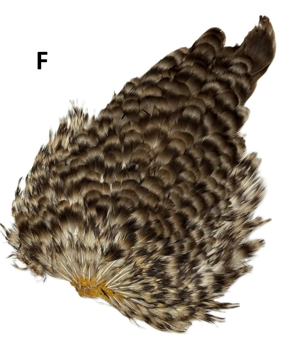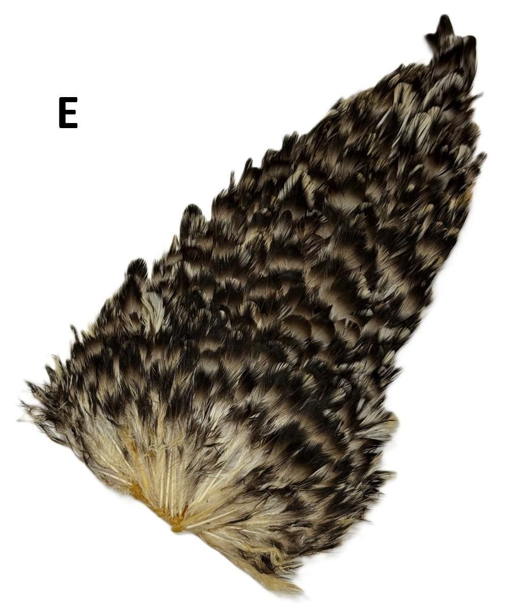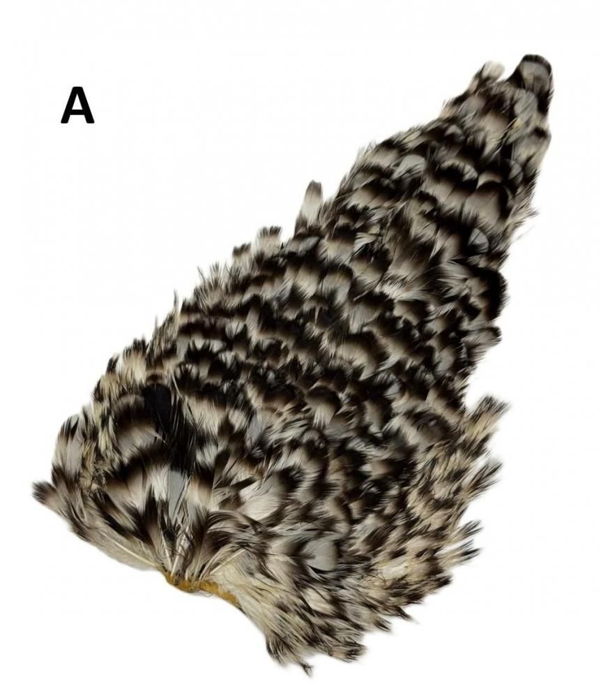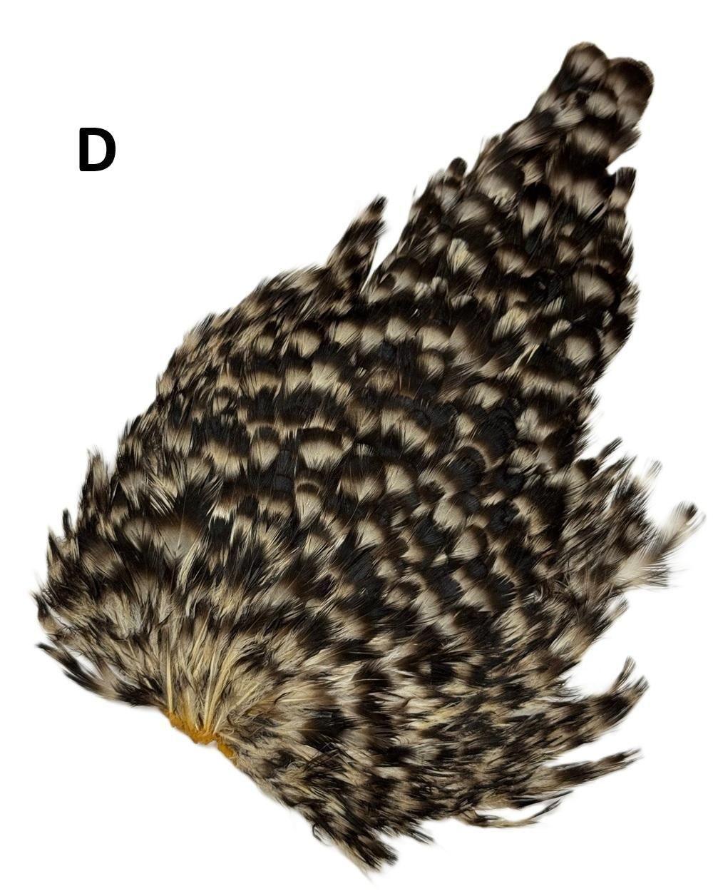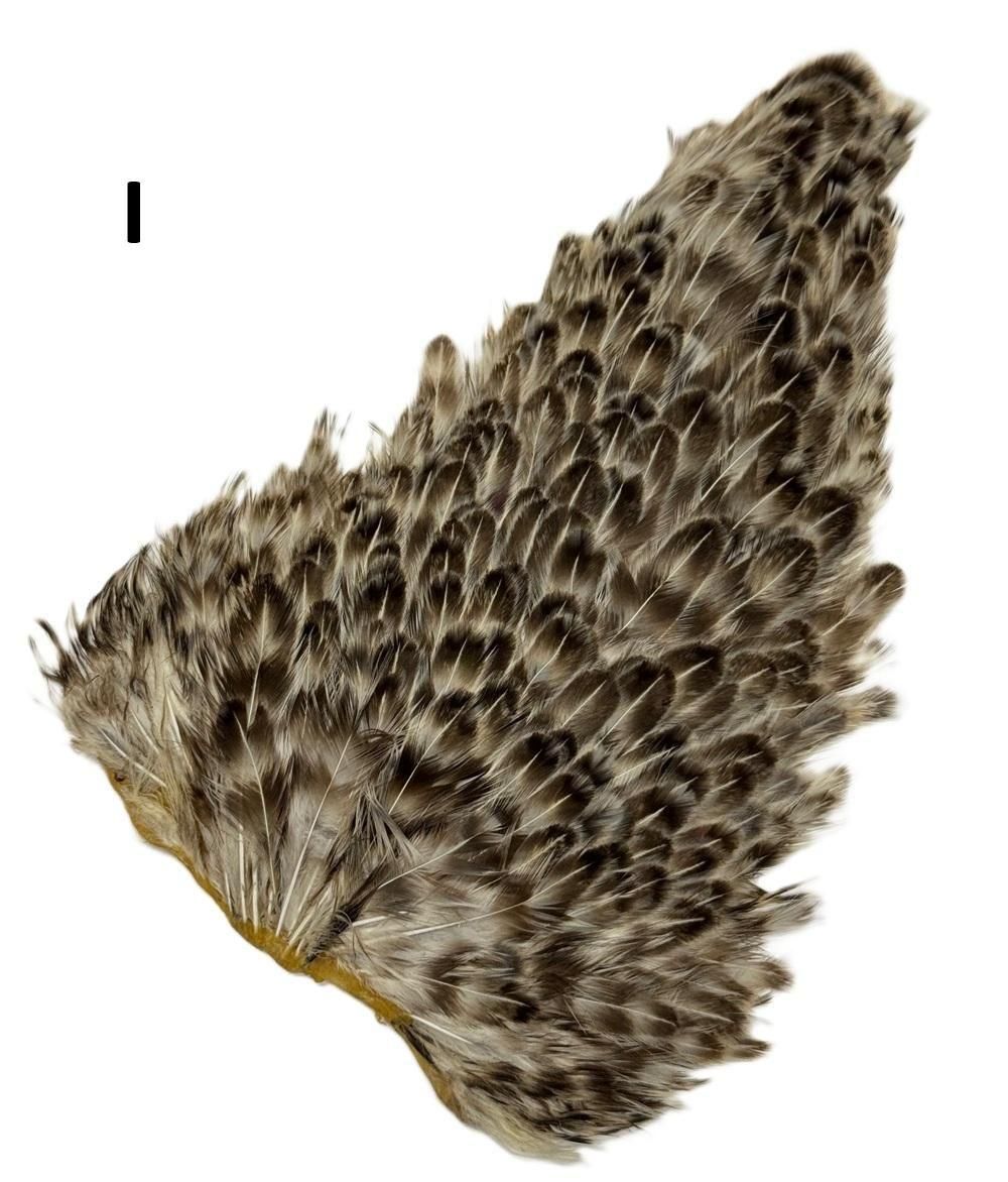 メス鶏のサドルハックルは、オス鶏と違って丸い形の極柔らかなハックルです。 ヘンネック以上に多彩な模様があり、スペックルド柄をしたハックルも多くあります。ファイバーは軟らかく長めで、ソフトハックルやウエットフライで よく使われる #12〜#6サイズがとれます。止水や緩やかな流れで威力を発揮します。それより大きなハックルは、マツーカのウイングや、フラットウィング に最適です。変わった使い方としては、スカルピンやドジョウのヒレにも面白いです。また、ウィングバーナで焼いてメイフライやカディスのウイングにしたり 色々な用途があります。