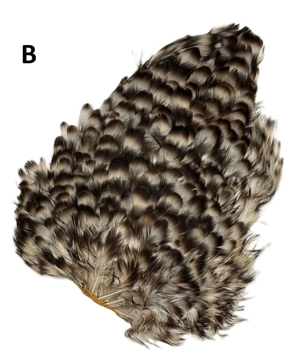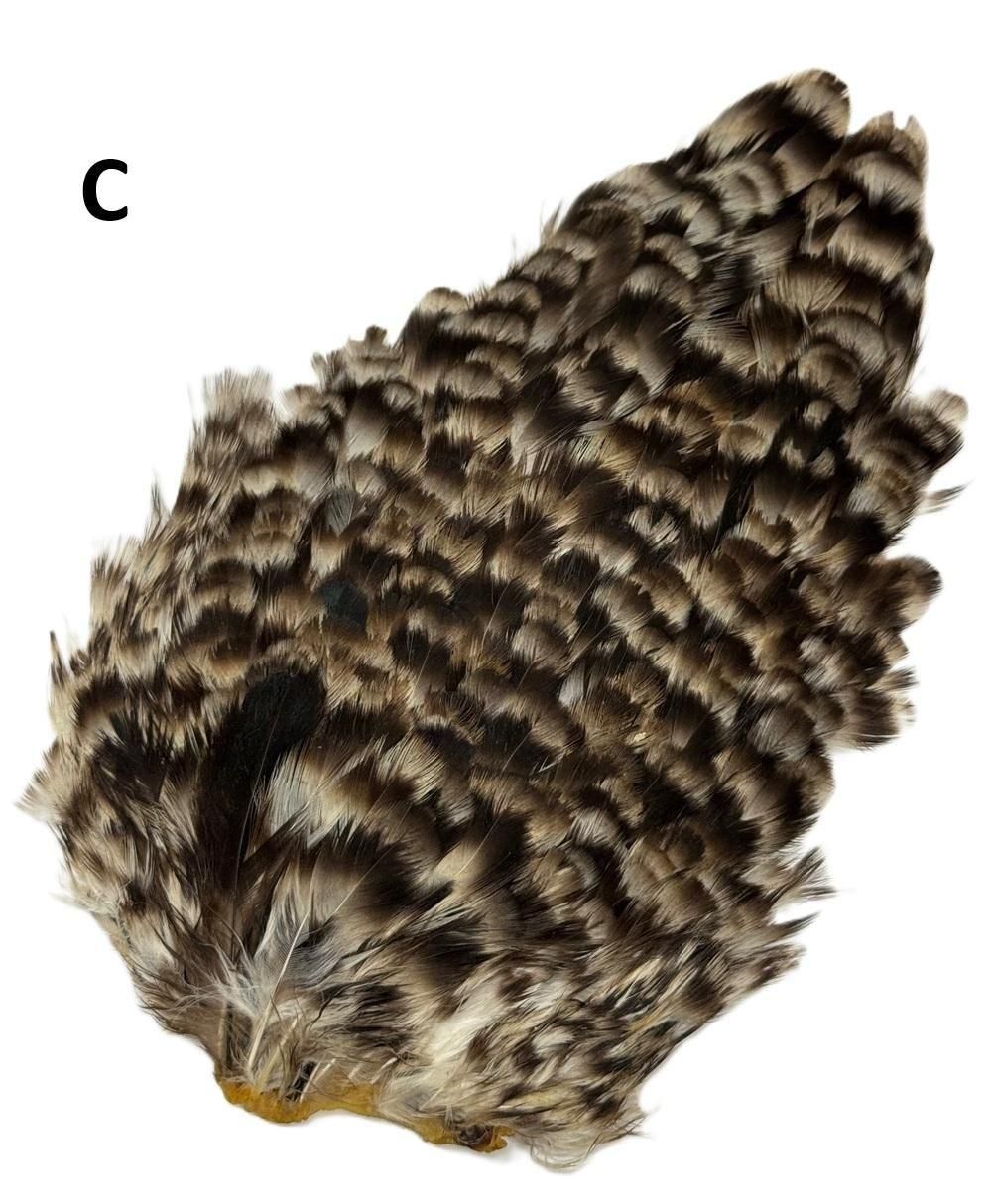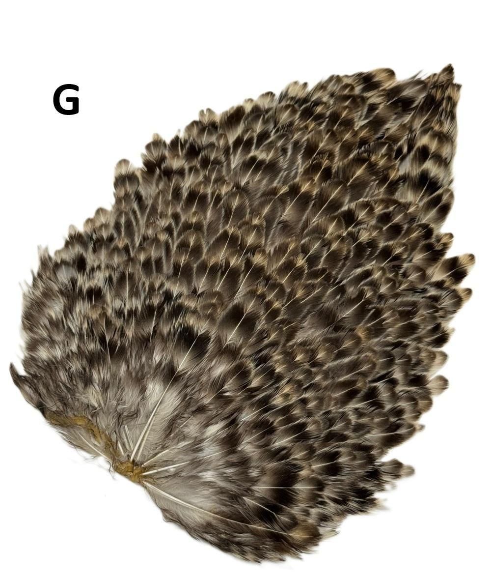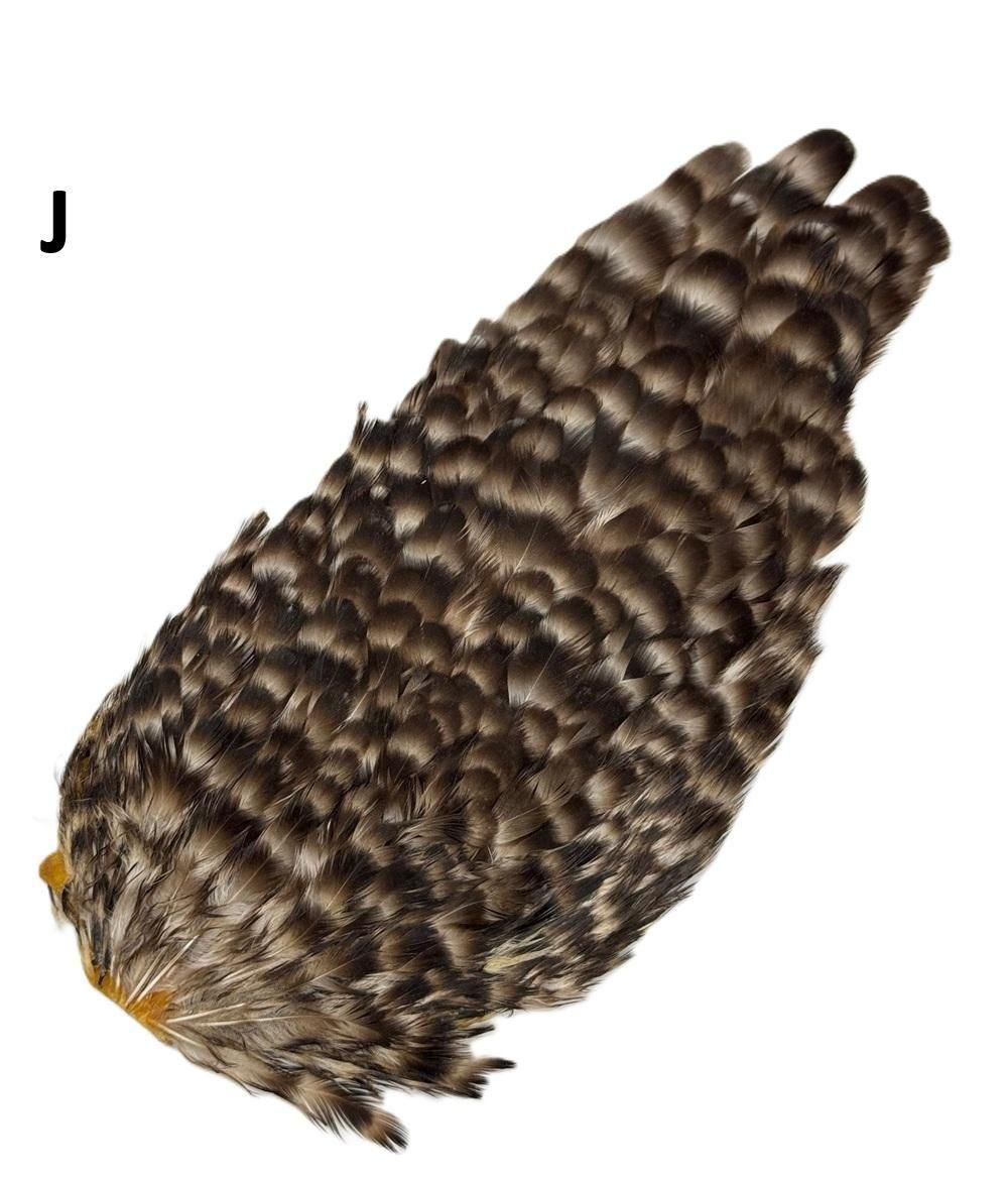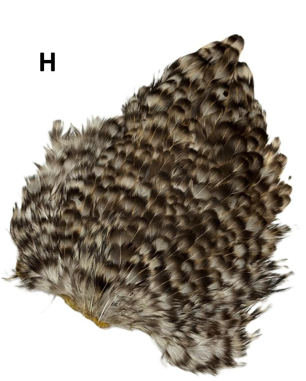 メス鶏のサドルハックルは、オス鶏と違って丸い形の極柔らかなハックルです。 ヘンネック以上に多彩な模様があり、スペックルド柄をしたハックルも多くあります。ファイバーは軟らかく長めで、ソフトハックルやウエットフライで よく使われる #12〜#6サイズがとれます。止水や緩やかな流れで威力を発揮します。それより大きなハックルは、マツーカのウイングや、フラットウィング に最適です。変わった使い方としては、スカルピンやドジョウのヒレにも面白いです。また、ウィングバーナで焼いてメイフライやカディスのウイングにしたり 色々な用途があります。