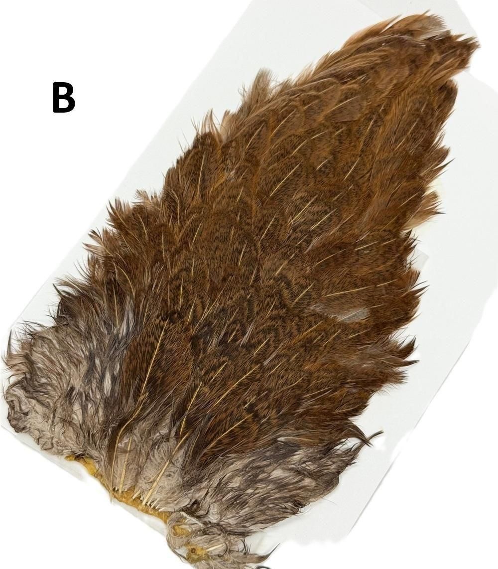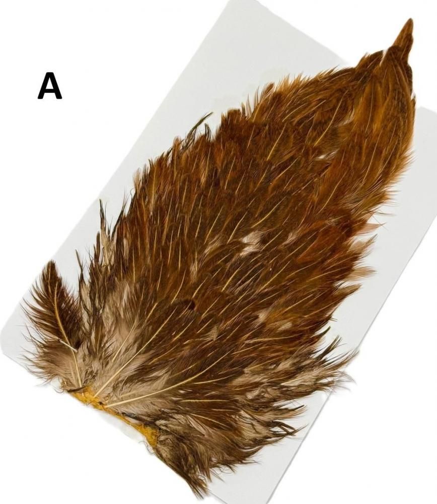 メス鶏のサドルハックルは、オス鶏と違って丸い形の極柔らかなハックルです。 ヘンネック以上に多彩な模様があり、スペックルド柄をしたハックルも多くあります。ファイバーは軟らかく長めで、ソフトハックルやウエットフライで よく使われる #12〜#6サイズがとれます。止水や緩やかな流れで威力を発揮します。それより大きなハックルは、マツーカのウイングや、フラットウィング に最適です。変わった使い方としては、スカルピンやドジョウのヒレにも面白いです。また、ウィングバーナで焼いてメイフライやカディスのウイングにしたり 色々な用途があります。