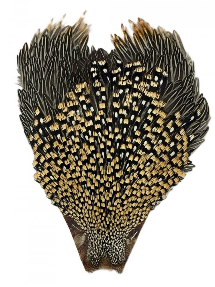 インド原産の野鶏の一種。首部にアイフェザーと言われる、大小の黄色と白の玉が縦にならび(まれに両方の玉が白いものも ある)、 その周りが黒の、エナメルを塗ったような光沢のある羽根を持つ高価なマテリアル。